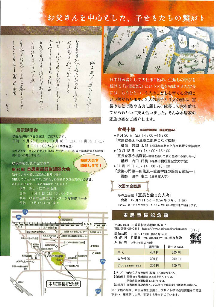 現在、秋の企画展「本居家のこどもたち」を開催しています。宣長には、5人のこどもを育てる父親という顔があります。2人の息子と3人の娘は、宣長のもとで歌や古典に親しみ、成長して家を離れてからも互いに支え合いました。本居家の家族の姿をご紹介します。ぜひ、ご来館ください。