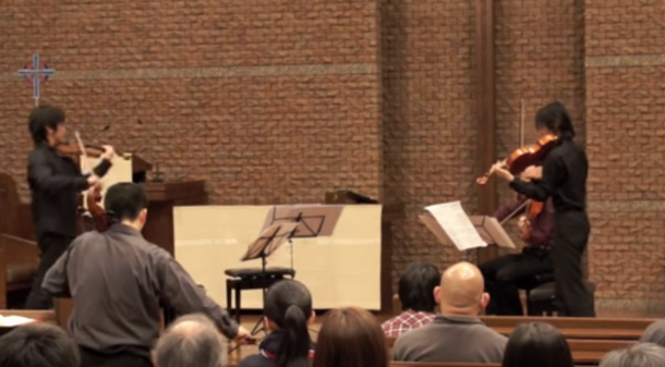 当日の会場は音響的にも広さとしても理想的な東京文化会館小ホールですから、弦楽器の飛び交う音を追ったりしながら充分楽しめると思います。第一ヴァイオリン・辺見康孝、第二ヴァイオリン・亀井庸州、ヴィオラ・安田貴裕、チェロ・多井智紀さんによる4人の演奏者は初演と同じメンバーでどんなことを書いてもたちどころに実行してしまう、まさに達人たちですね。一部分でしたが最初のリハーサルの時に渡した新しい楽譜をすぐさま予見練習もなしに創り上げる能力は私にとって異次元の世界でした。今回の再演が楽しみです。