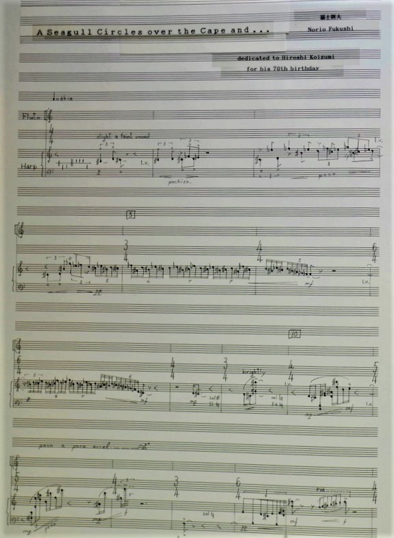 休憩を挟んだ後の演奏予定作品が「カモメは岬を巡り」になります。オーケストラ作品や弦楽四重奏やフルート+ハープによる編成は作曲家として一度は書いて音にしてみたいジャンルではないかと思います。書きたいと思う時期と演奏家からの依頼のタイミングが一致することはそう多くはないのですが、そういう意味ではこの作品は幸運でした。木村茉莉さんは1970年後半から80年代にかけて活動していた演奏家と作曲家によるグループ〈アンサンブル・ヴァン・ドリアン〉の仲間でした。その張りのある透徹した音色は魅力的で、書いてみたいと思わせる演奏家でしたが、なかなかその機会が得られませんでした。反対に藝大で同級の小泉浩君には学生時代から数えて一体何曲書いたのやら。そして5年前、小泉君の祝賀パーティでお披露目の作品を提供することになり、もうこの組み合わせしかないでしょう、ということで書いたものになります。当日は全音楽譜出版から6月発刊の楽譜を販売する予定ですので興味ある方はぜひ手に取ってご覧になって下さい。