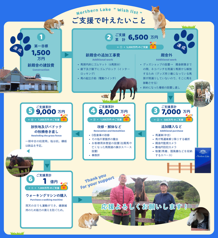 6500万円も早々に達成することができ、新厩舎の追加工事と厩舎外の整備ができるようになりました。これまでは馬の体調や建造物の老朽化など不安なことのほうが多かったのですが、今回のクラファンで皆様と一緒に理想の牧場を作り上げているような気分になり、久し振りにワクワクしております。本当に皆様のお力添えのお陰です!