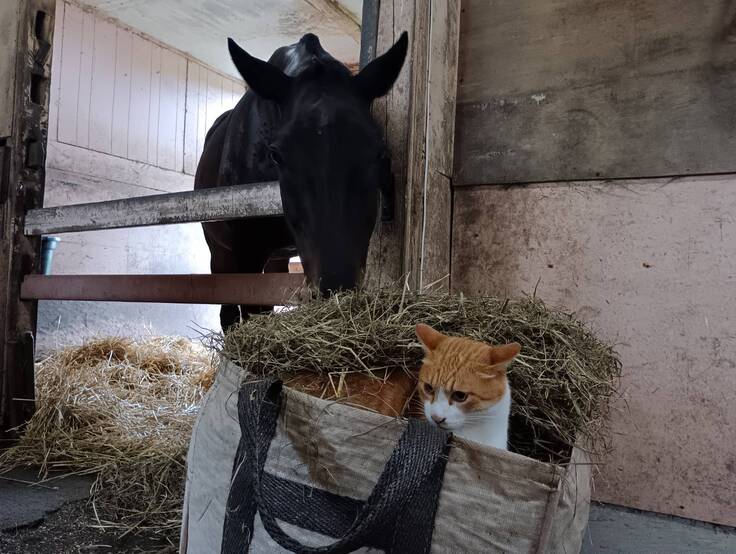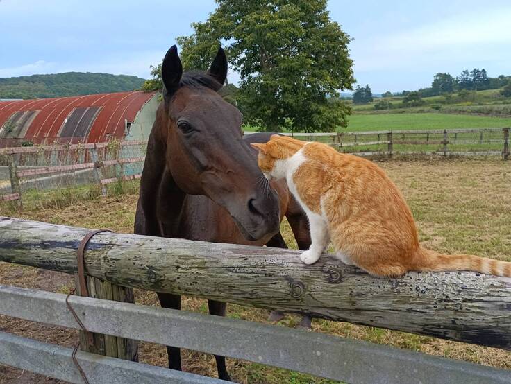 しかし、最初から牧場猫のメトには興味を示し、近くに来ると匂いを嗅ごうとしたり、目の前を通ると首を伸ばして鼻を近づけていました。ドトウをはじめとする他の馬たちもメトが好きで自分たちの仲間だと認めていると感じますが、名前がネコパンチだけあってかなりの猫好きに見えます。