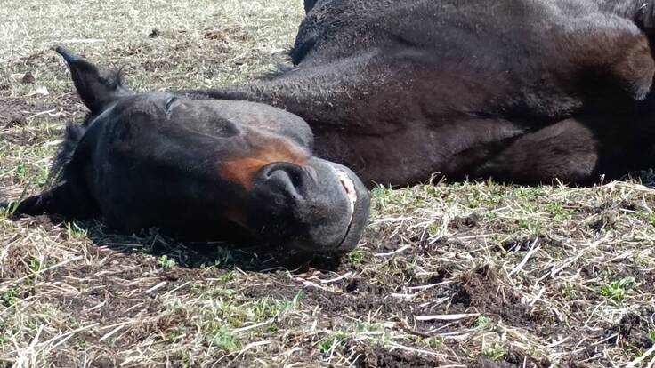放牧地で見学者がいるいないに関わらず、ゴロッと横になり寝ていることがよくあります。しかもウーッと唸ったり、イビキをかきながら眠っているので、思わずプッと吹き出してしまいます。