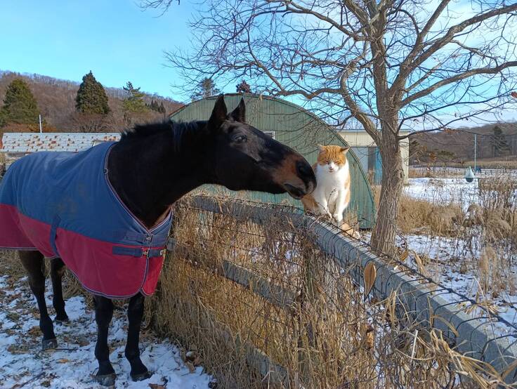 合計5頭の馬と、牧場の看板猫「メト」に、家の中には「チビ」と「福豆(ふくちゃん)」の3匹の猫が暮らしています。