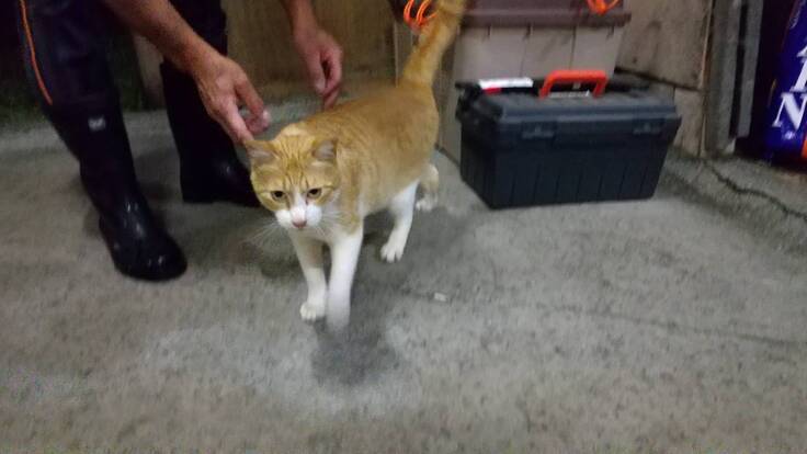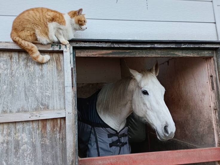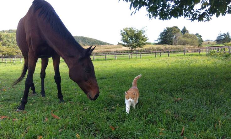 牧場に引っ越してきて4日目に、草刈りをしていた親族の足元から突然飛び出してきたのが、茶白の一匹の猫でした。初めから物怖じせず厩舎に入り込み、夕方には「仲間に入れてくれ」と言わんばかりに私の顔を見上げながら大きな声で鳴き続けました。