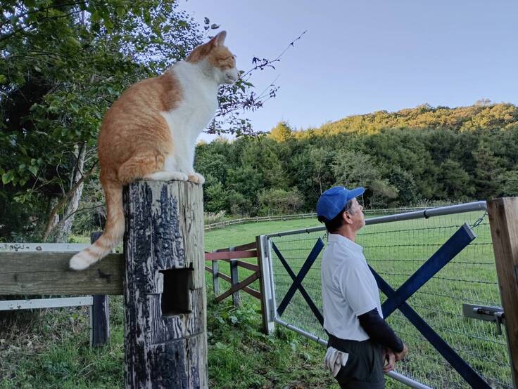 メトはその後、牧場の“看板猫”として大活躍します。メイショウドトウの背中に乗る動画がSNSで拡散され、一躍人気者に。見学者が来ると、自ら現れて写真撮影に応じたり、肩や膝に飛び乗ったりと接待までしてくれます。「買っておくれにゃ」とばかりに販売しているグッズが並んでいるテーブルの上に乗ってアピールもよくしています。放牧地に飲み水を入れるバケツと水の入ったポリタンクを運ぶ軽トラックに同乗することもあります。