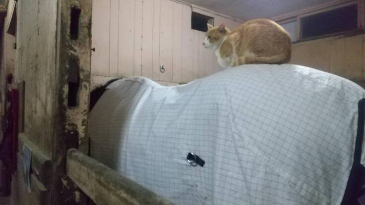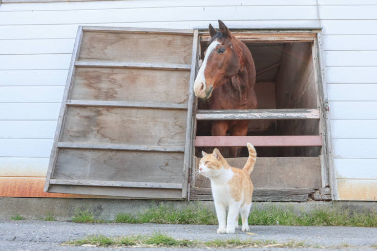 その後も当然のように牧場敷地内で行動し、馬と触れ合ったり、作業をしているそばでのんびり過ごしたり、馬たちが放牧に出ると馬房の藁の上で丸くなって寝ていて、まるで最初から家族だったかのような存在感でした。しかし、最初は生き物を飼うと責任が生じるからと、来客に「飼い猫ですか?」と聞かれても、あえて「いや、野良猫です」と川越は答えていました。