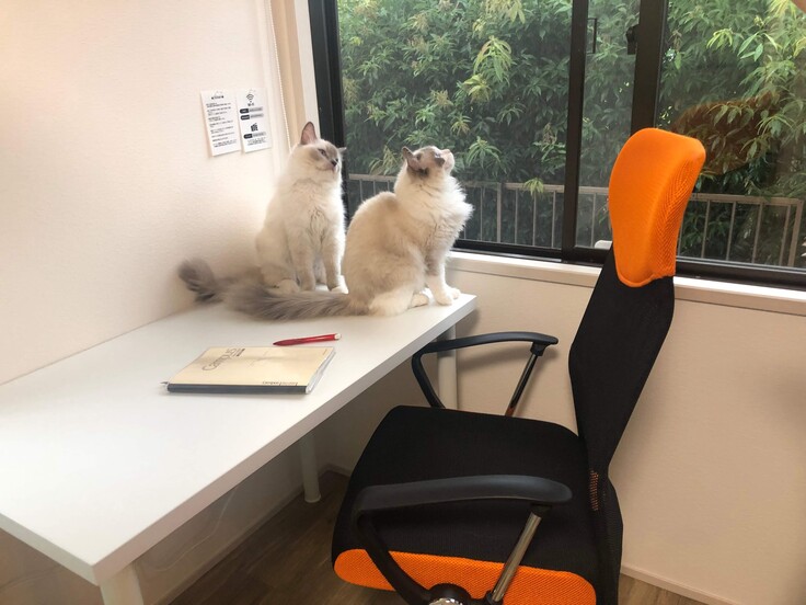 令和4年2月、猫のいるコワーキングスペースを開設しました。ブリーダーの飼育崩壊で保護された猫2匹に日々癒しと元気をもらっています。