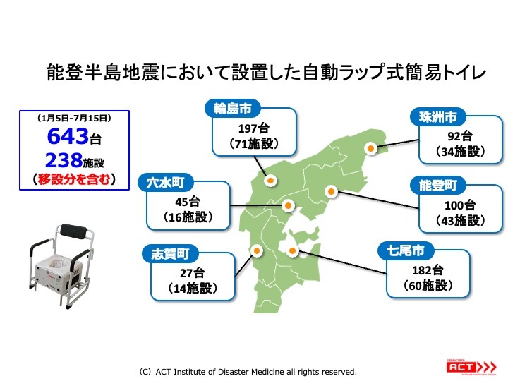 今回の活動では、1月5日〜7月15日の期間に、238施設643台の自動式ラップトイレを設置し、設置場所に対して、消耗品を継続提供してきました(図-1)