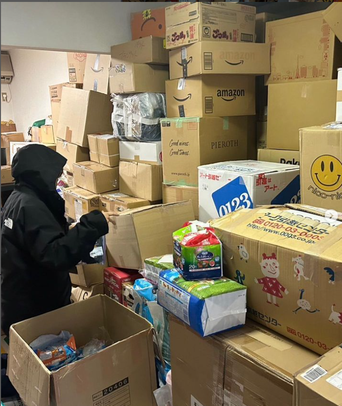 ゼローム施設にて支援物資の保管を始める。開始後まもなく物資でいっぱいになり
