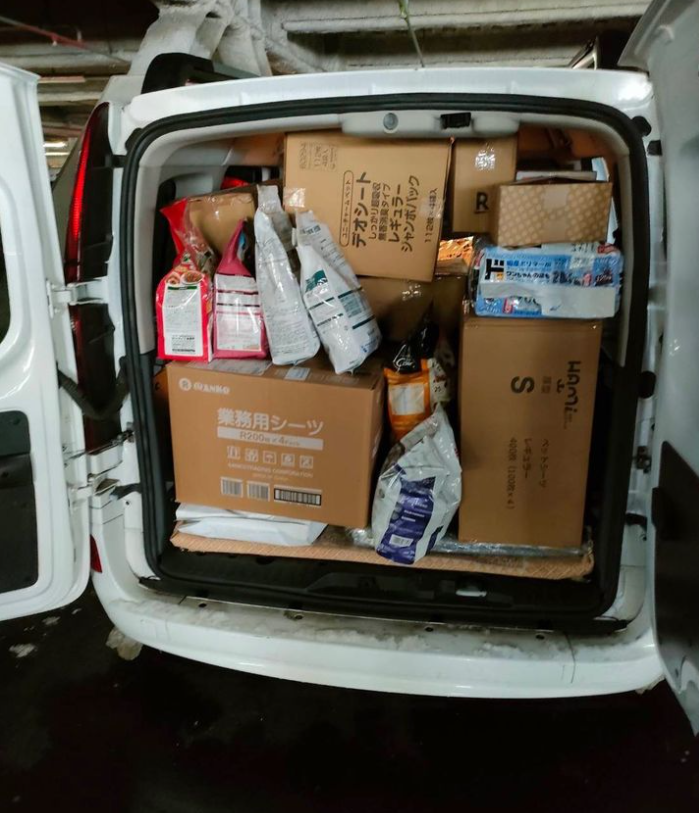 具体的には、複数の物資配給所への輸送と配布活動の継続、山村集落やへき地にお住まいのペット家族方への支援で