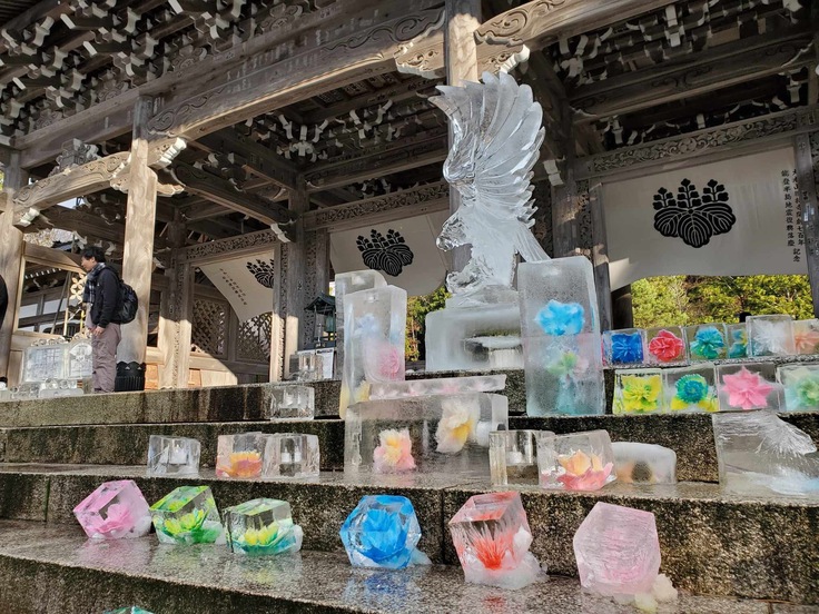 長野氷彫倶楽部のみなさんのご協力で、色とりどりの氷のアートが山門の前に飾られました。