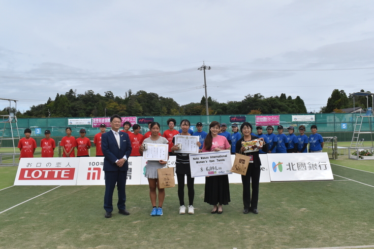 <シングルス表彰式 左から茶谷七尾市市長、清水綾乃、伊藤あおい、南野陽子、佐藤直子>