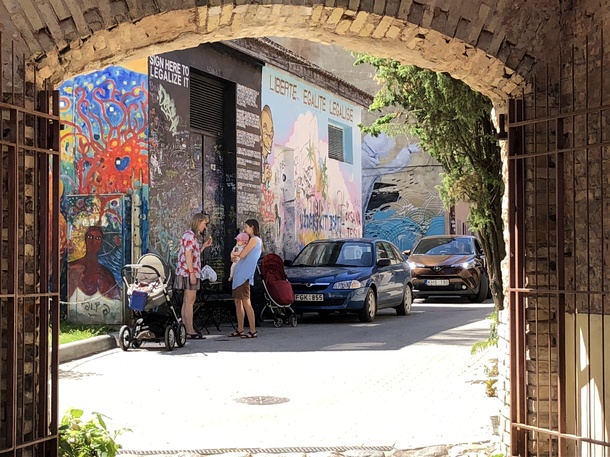 ウジュピス共和国はかつてヴィルニュスの中でも空き家が多かった地区。そこにアーティストが集まりだし、イベントを開催したり、空き家をリノベーションしたりして、注目度が高まっているエリアです。