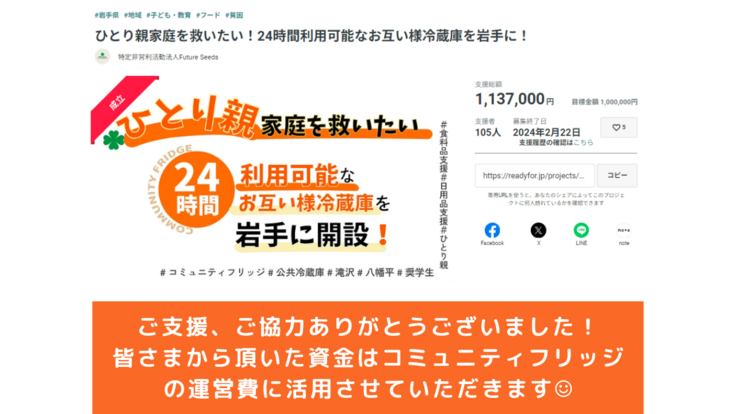 約50日に渡って駆け抜けてきましたクラウドファンディング 最終的に105名の方々にご支援頂き、目標金額100%を超える113万7千円ものご支援を頂きました。今現在、コミニティーフリッジ登録者は50世帯250名ものひとり親世帯や貧困学生の方々が利用しています。