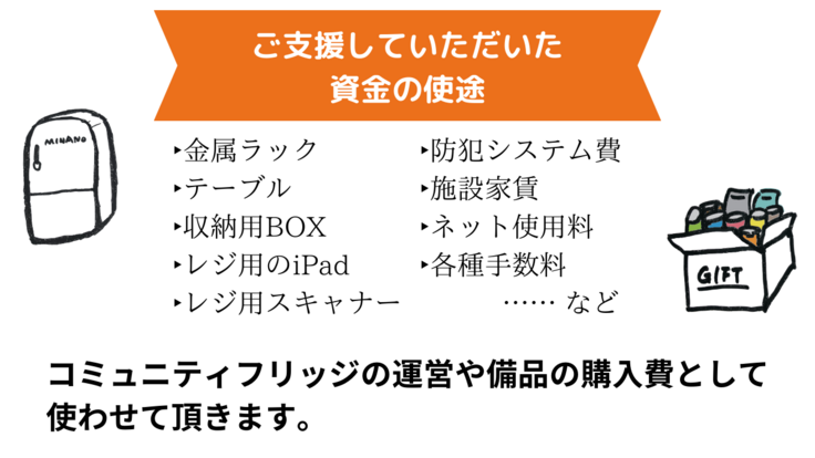 沢山の方に利用して頂いているコミニティーフリッジは全て寄付金で、食材、日用品を購入し支援しています。