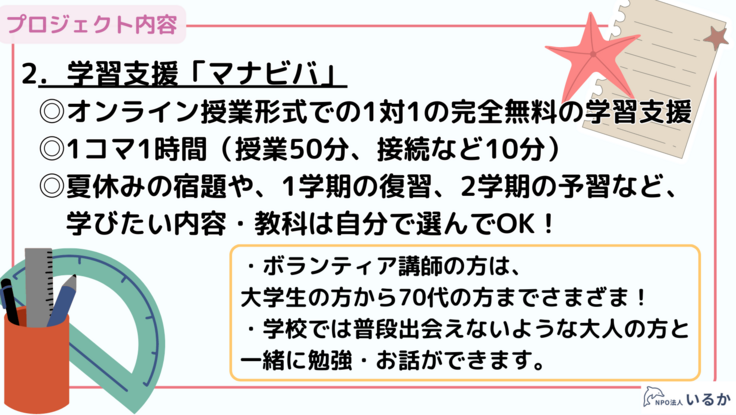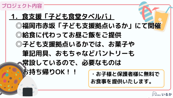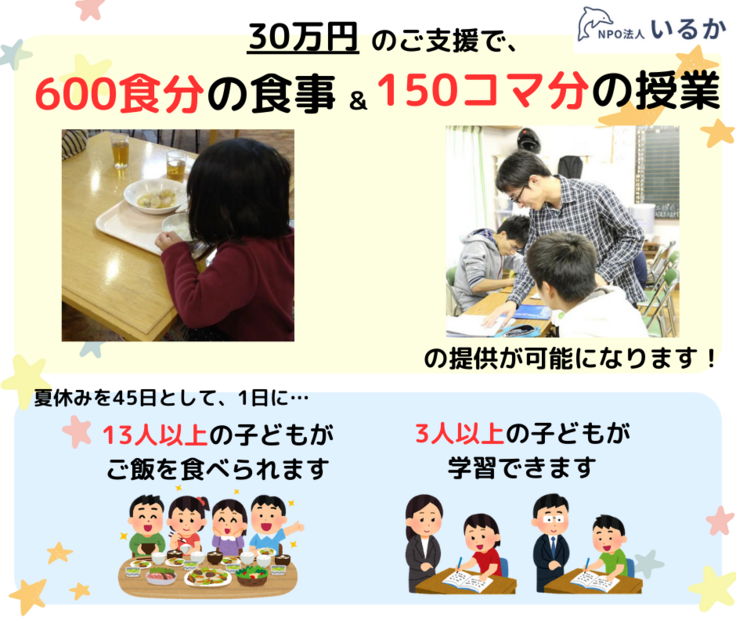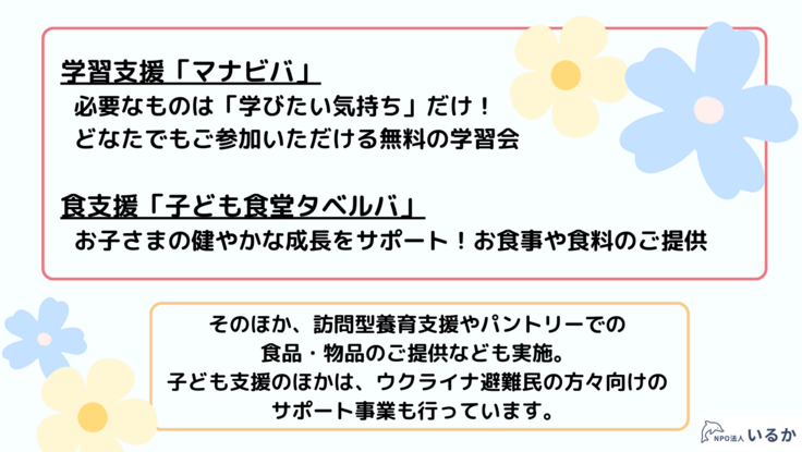 NPO法人いるかが、オンラインまたは福岡県福岡市内の拠点にて、子どもへの学習支援及び子ども食堂での食事提供を実施する。 集まった資金は、学習支援ポランティア様への謝金支払及び食材の購入に使用いたします。