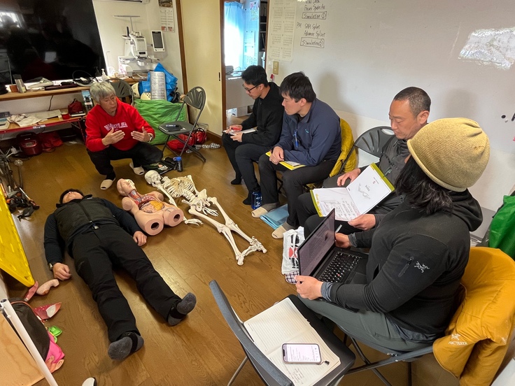 野外救急の講習で人体の構造をもなんでいる様子です。