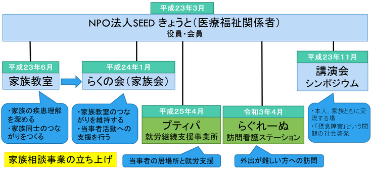 平成23年に京都で摂食障害者を支援する任意団体「SEED(しーど)きょうと」を立ち上げました。立ち上げ直後より、「きょうと摂食障害家族教室」を開始し、平成24年には家族会「らくの会」の運営を開始しました。毎年、一般市民向けのシンポジウムや医療福祉関係者向けの講習会なども行いながら、平成25年には当事者の利用できる通所施設「SEEDテラス」を開設しました。平成27年10月15日に「SEEDきょうと」はNPO法人となり、平成28年度には摂食障害者の通所支援施設「プティパ」を解説しました。平成29年度もそれを維持し、平成30年4月1日に、障害者総合支援法に基づく障害福祉サービス事業(就労継続支援B型事業所 プティパ)として京都市から指定を受けることができました。さらに令和3年4月には、訪問看護ステーション らぐれーぬ を開設し、来所できない方などに対する訪問での支援も開始しました。令和5年度には、家族相談事業の立ち上げも準備を始めています。今後も プティパ と らぐれーぬ を中心に、摂食障害者およびその家族に対する摂食障害者およびその家族に対する包括的な地域支援活動を展開していく方針です。