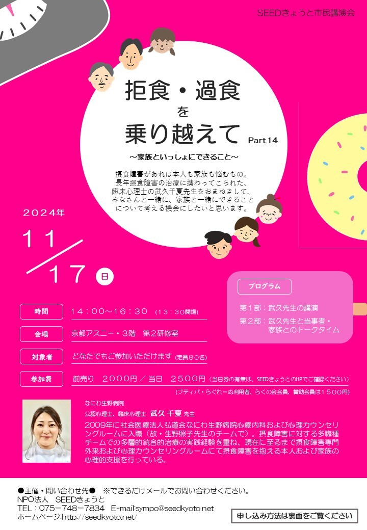 SEEDきょうとでは、結成以前から摂食障害の方やご家族を中心に、摂食障害についていろんな方に広く知っていただくことで、病気に悩む方が少しでも生きることや回復への光を見出し、また地域で安心して暮らせるようにという思いのもと、『拒食・過食を乗り越えて』という市民講演会を開催してきました。
