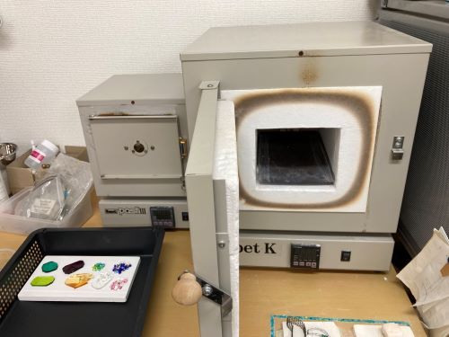 陶芸とはまた違う、少し小ぶりのガラス用の焼成器で焼き上げます。