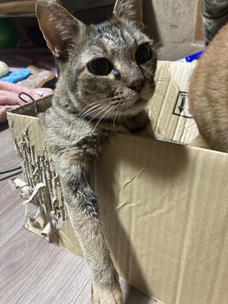 でも実際はお風呂じゃなくて…お気に入りのダンボールでくつろぎ中なんです。
