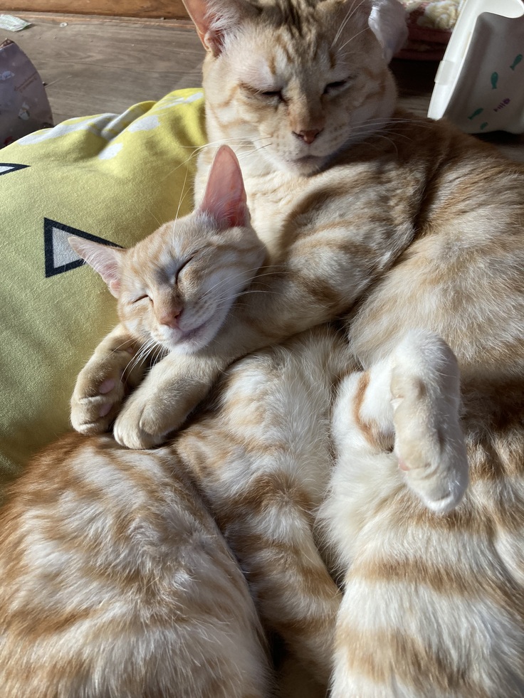 小さなサンちゃんは少し苦しそうではあるけれど、その隣にいるおうくんの温もりに安心しているように見えました😊