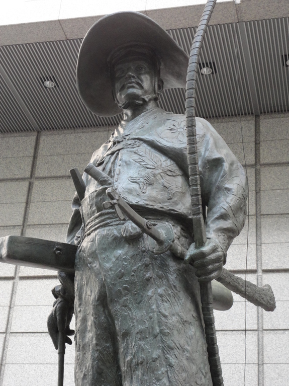 ★写真は、鷹狩りの装束の大田道灌像です。有楽町の東京国際フォーラムの建物の中にあります。
