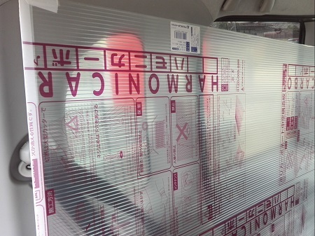 ホームセンターでポリカーボネートの透明断熱ボードの一番安いものを買ってきました。約900x1800なのでトールボディの軽自動車の助手席側を倒してようやく入りました。