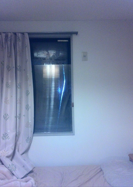 対策前です。すでに柔らかい断熱シートを張っていました。これは断熱のための空気層もあるのですが、窓に直接張り付けているためそれ自体が冷えて、結局屋内側に水滴が沢山ついていて、役に立ちません。空気層の中にも水が入っているという本末転倒っぷりでした。