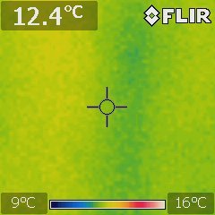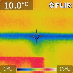 窓より上側の温度です。真ん中の横方向青線は天井と壁の境目です。ここが10℃と結構冷えていました。構造上断熱材を入れにくいところなのかもしれません。