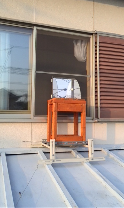 エアコン室外機用の市販台と木の台を使い、その上にぬくみちゃんを据えています。