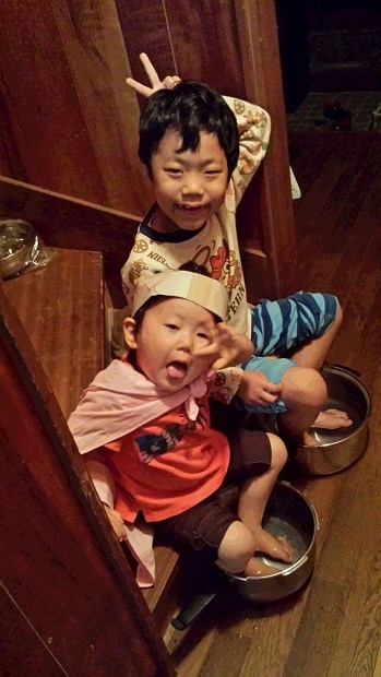 足湯は子供たちにとって楽しいでしょうね。大人だと洗面器かバケツでやったりするのですが、鍋というのが何ともほのぼのするではないですか!