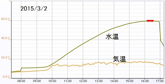 ということで水温データです。最高温は59.3度、丁度赤いマークがついているところです。曲線も綺麗なので快晴だったのでしょう。初期水温+48.6度という良い結果でした。