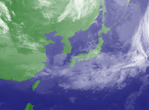 大陸から帯状に雲が供給されています。今私がいる関西でもそうですが、九州でも雨ではないけどスッキリ晴れない状況でしょう。