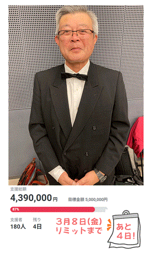 3月4日7時現在で、なんと180人のみなさまから439万円のご支援が集まりました。達成率88%です。ここまでのご支援を得ることができましたこと、深くお礼申し上げます。