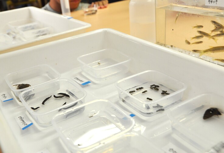 8月の実習では、東吉野村の川で水生昆虫や魚、藻を採集し、川の生物や、それらの棲む環境について学びます。また、顕微鏡を使って、肉眼では見えない生物も観察することができます!
