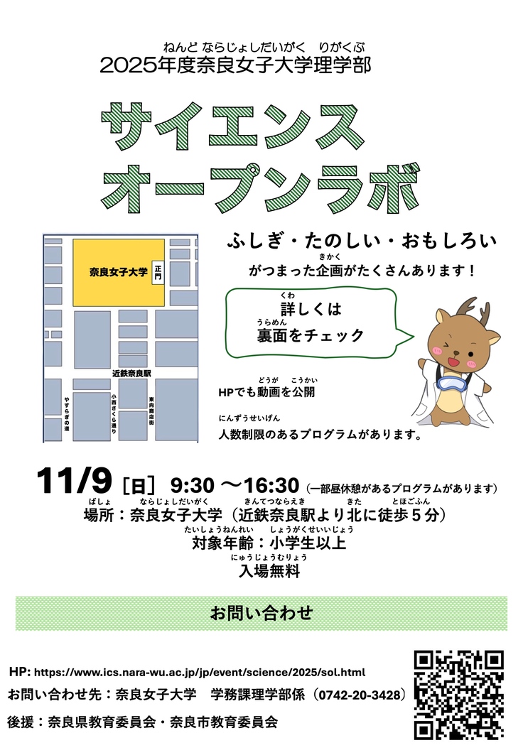 現在、奈良女子大学理学部の学生たちは11月9日(日)に開催される 「サイエンス・オープンラボ」 に向けて、最後の準備に全力を注いでいます。展示づくり、リハーサルなど、学生主体の企画運営がいよいよ大詰めを迎えています。