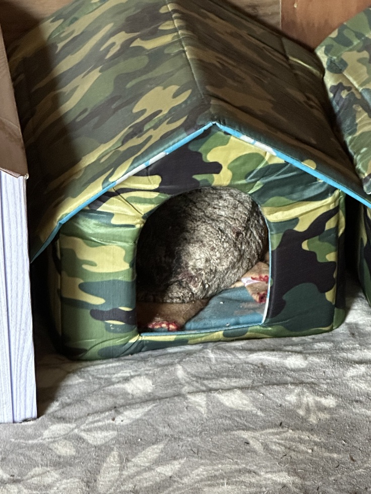 今朝、倉庫でお世話してるお外の子達のハウスに、なんとタヌキさんが入っていました💦