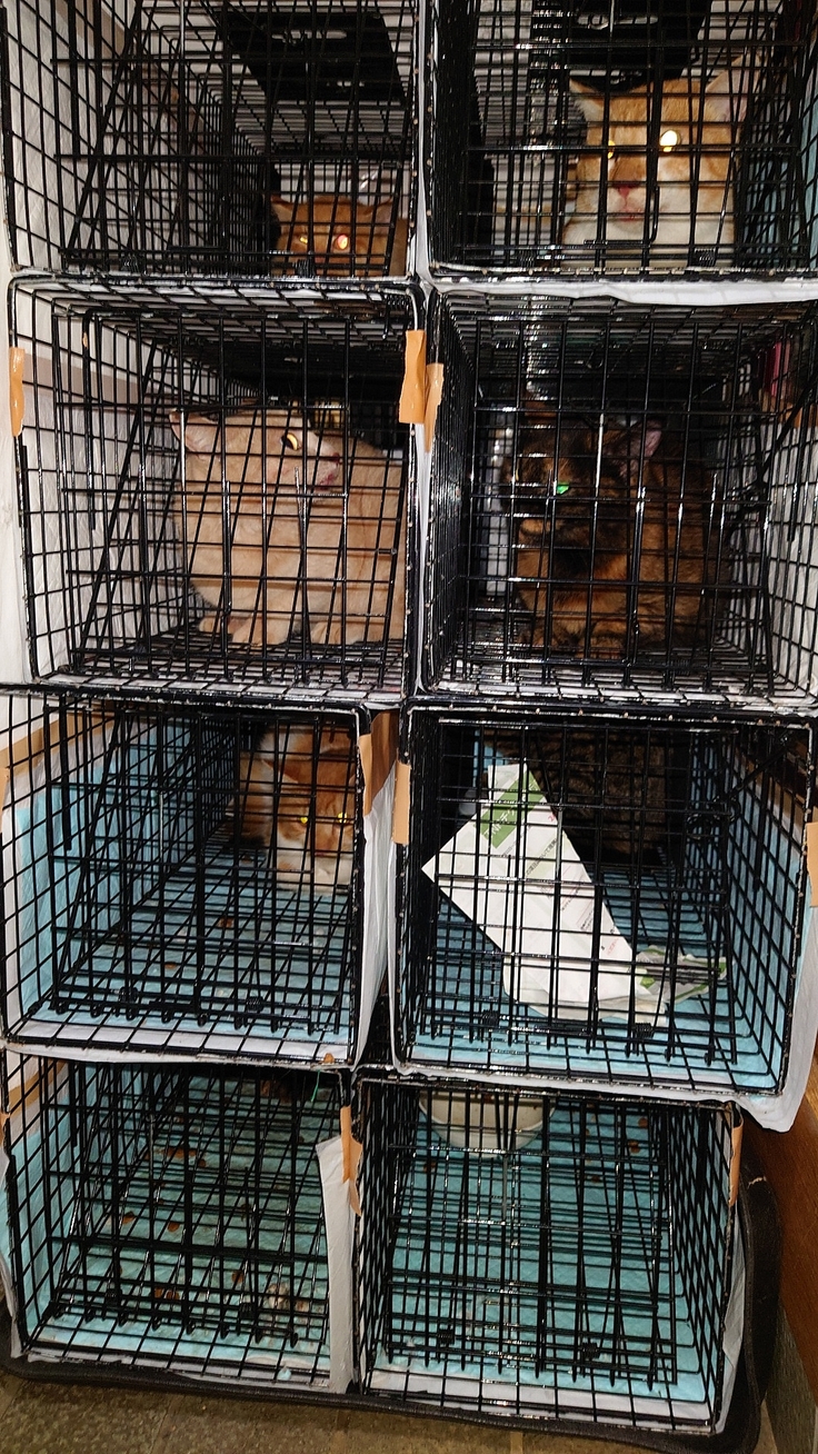 シェルター玄関たたきに捕獲器が積まれます。そう、各現場から集まって来るのです。毎週の出来事なのですが、餌をあげるのなら不妊手術をしましょう❢