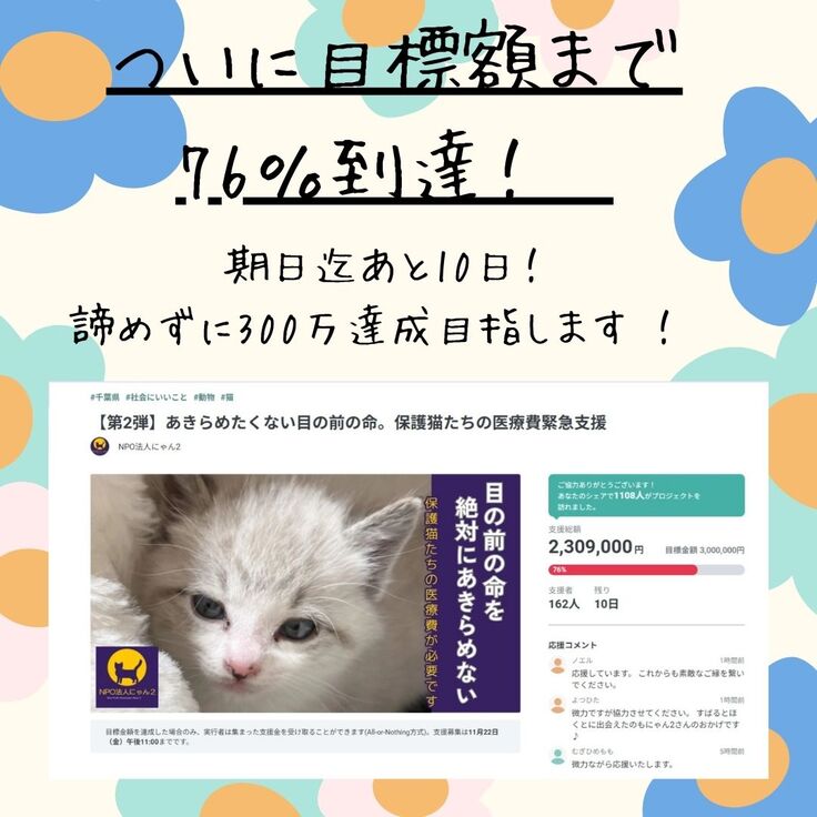 ※ 特別なリターン品をお届けしない代わりに、ご支援のほぼ全てをプロジェクトに充てさせていただきます。猫たちのためにありがとうございます。