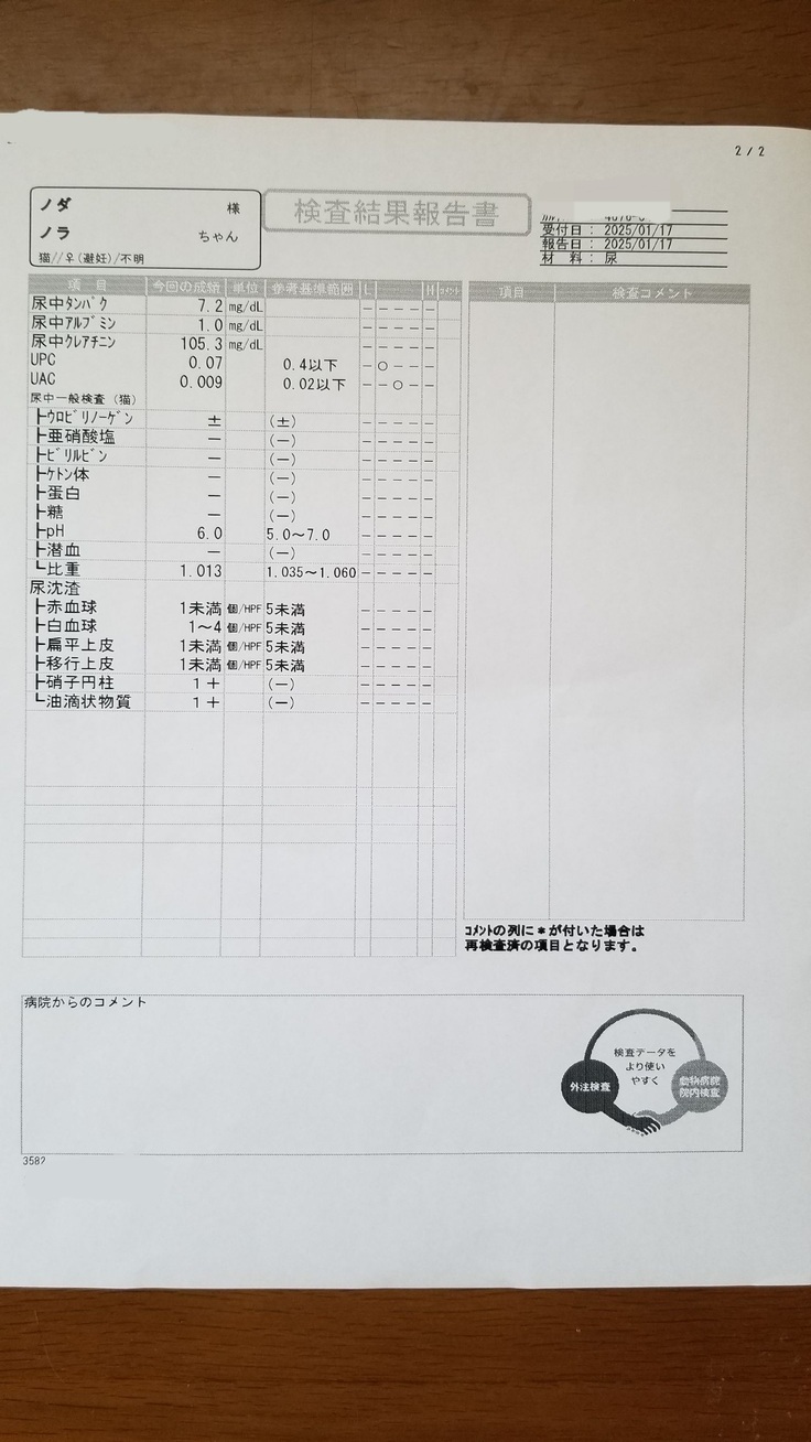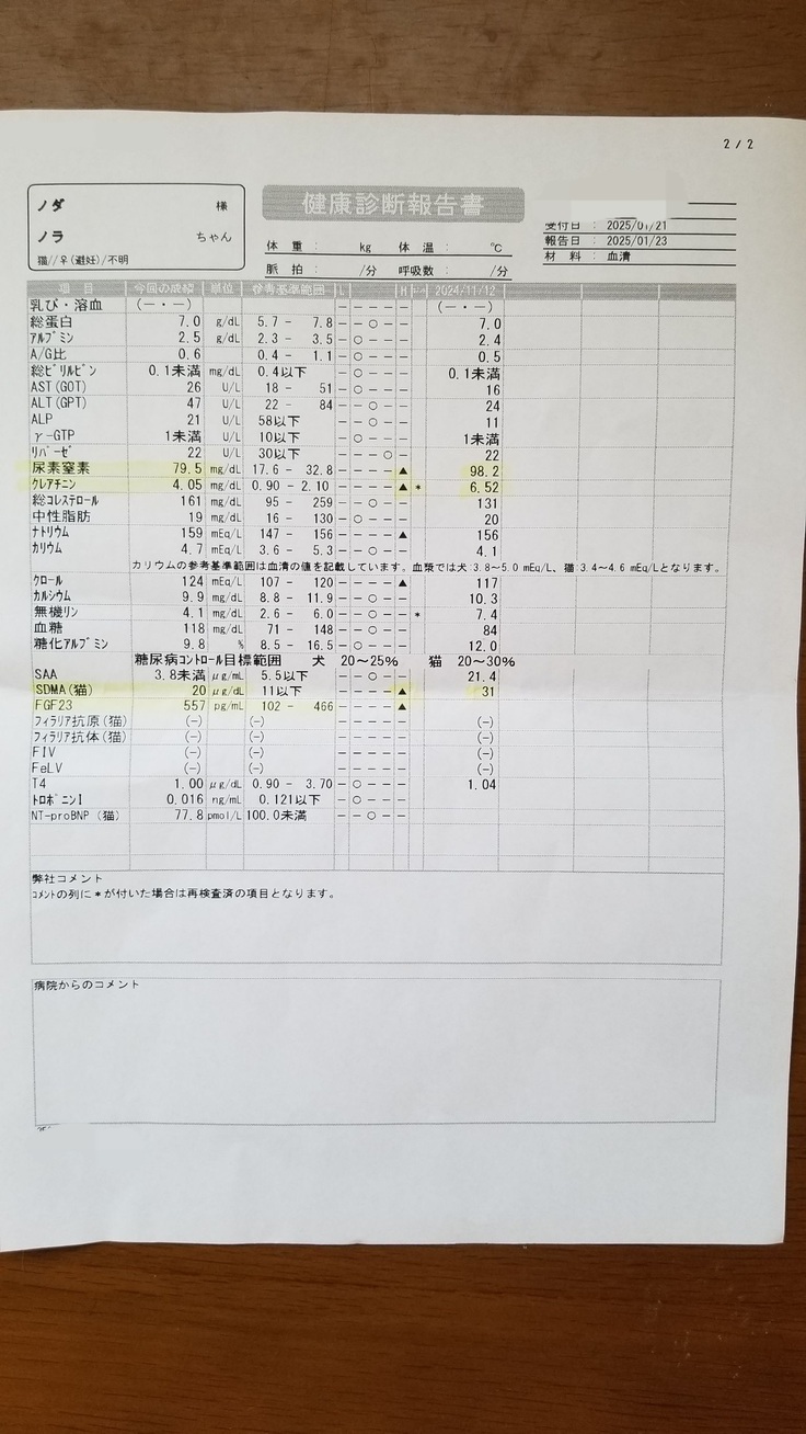 詳細の検査は外注していたようで、病院のデータと少し数値に差はありますが、これが今ののらちゃんの現状だと思っていただければと思います。
