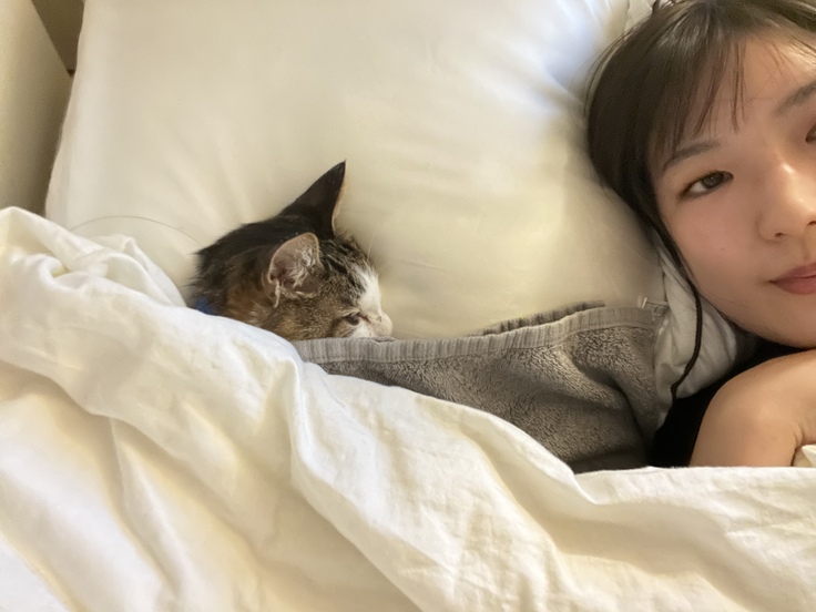 野良猫で推定年齢1〜3歳の成猫で保護した割には人見知りもなく甘えっ子で、一緒の布団で寝たり、私たちがソファに居るとお腹の上に乗りたがったりするような子でした。