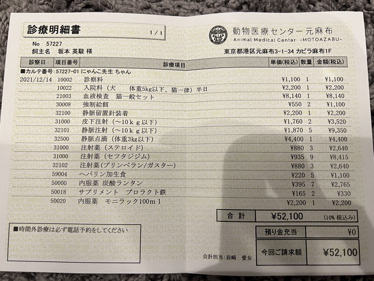 そのため、週2回病院で静脈点滴をすることで出来る限りの毒素の排出を促しています。しかし入院費は高額で一回の預かりで平均3万円ほどかかります。にゃんこ先生は容体が安定していないので、何か病が併発する度に別の治療もする必要があり、そうすると1日で5万以上飛んでいくこともザラにあります。