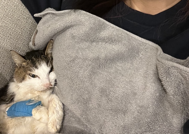 残りの5日間の自宅療養中は、5分の外出も避け朝から晩までにゃんこ先生の介護を行なっています。朝8時から夜24時まで1,2時間おきに薬やご飯を与え、この子が辛くないかどうか常に見守っています。正直、23歳の若者2人でみるには金銭的にも精神的にもキツい状況です。