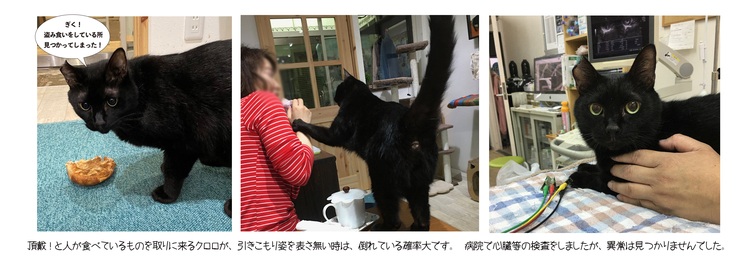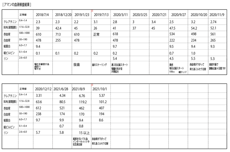 片側の腎臓が肥大し機能していない事が判明。3月からは週2回、9月からは毎日の点滴を開始。10月には腎臓貧血を発症。