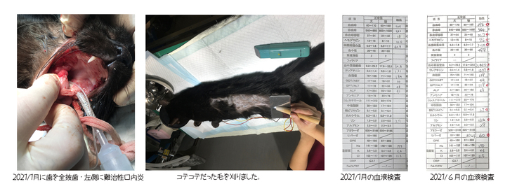 食欲不振の為静脈点滴を実施。 その後自宅に連れて帰り、病院通いを続けながら今なお頑張ってくれています。