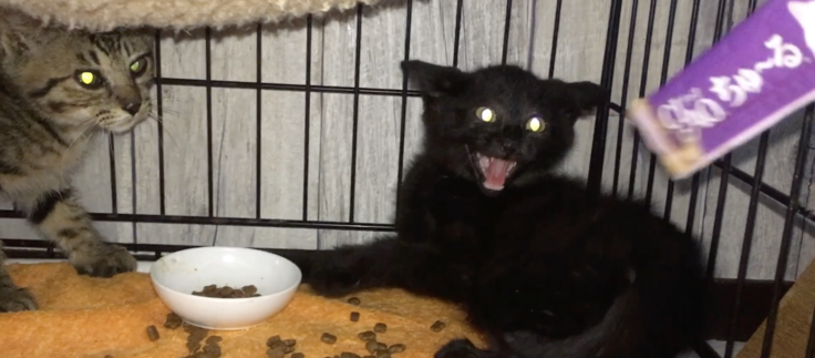 ミーコの面倒をモジャが見ていたようで、モジャが入った捕獲器の上にミーコが座っていました。ガリガリで子猫かと見間違えた程小さかったモジャ。