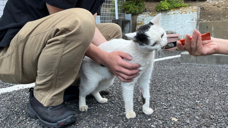 ちゅーるをみたら気力を振り絞り立ち上がり一生懸命になめてくれました。すぐに病院に連れて行き、とりあえず入院となりました。数日で回復してくれたモハちゃんはにゃん福゜で保護することになりました。優しい依頼者のお兄さんは医療費を支払って下さりました。