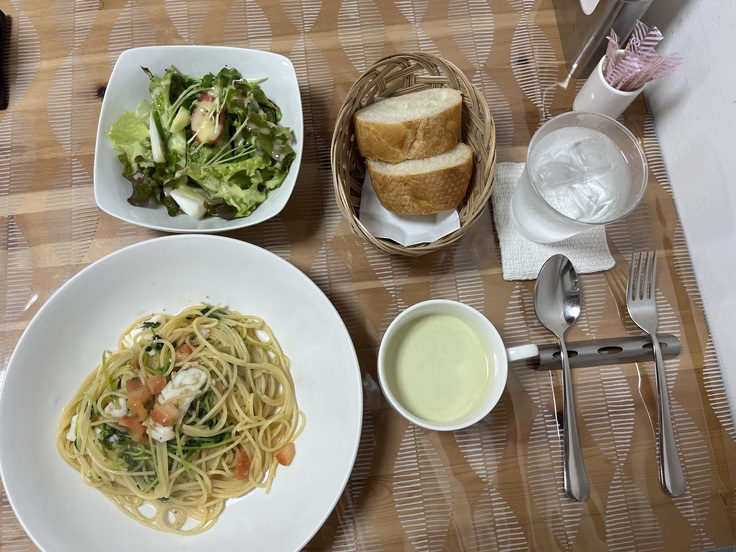 パスタランチにはサラダ、スープ、パンがついています