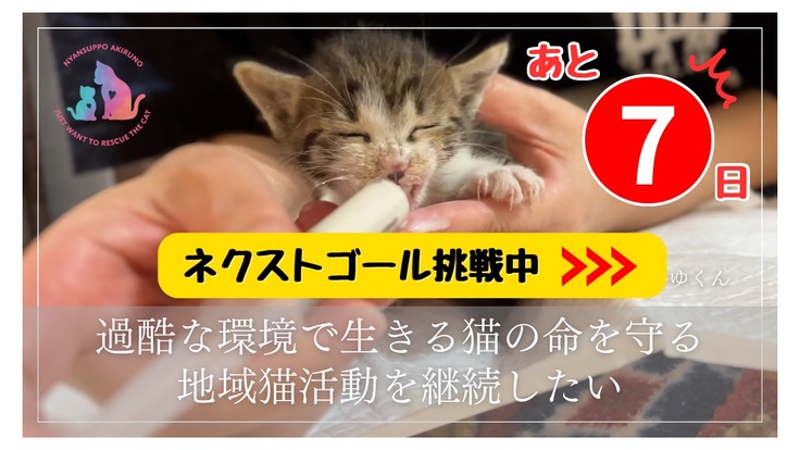 当初は最初の目標を達成したら挑戦を終了とさせて頂こうと考えておりましたが、このクラウドファンディング中に、ボロボロの状態の猫に出会い、病院で高齢で様々な病気があることがわかり、保護いたしました。その猫は「大吉くん」と名付け、現在は投薬、療養中です。皆様からたくさんの支援物資をいただき、大変助かっております。本当にありがとうございます。